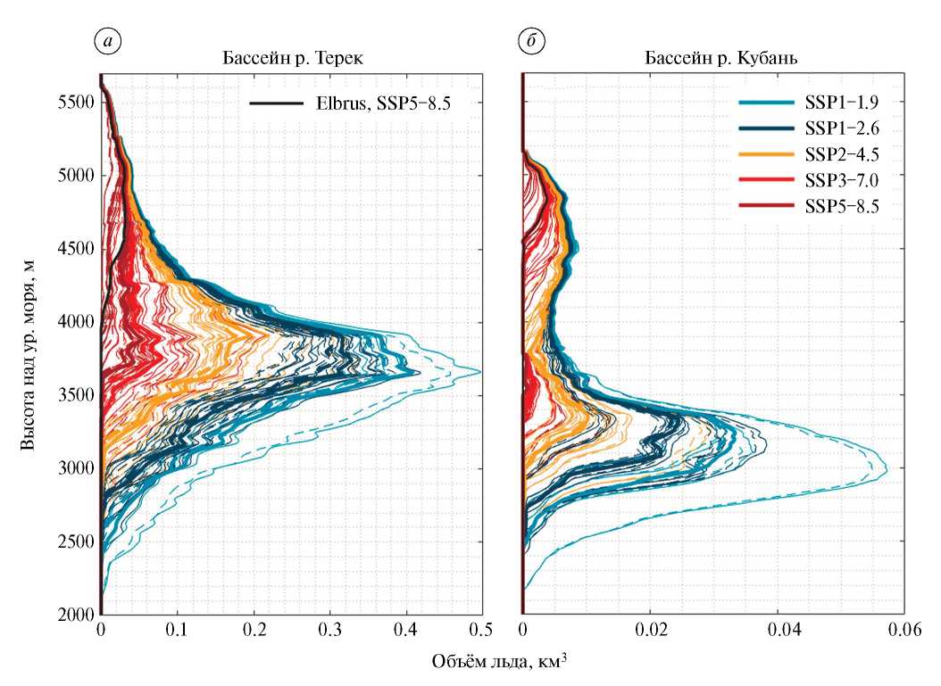 В бассейне р. Терек в климатическом сценарии SSP1–2.6 наибольший объём льда к 2100 г. сохранится на высотах 3500–4000 м над ур. моря. (рис. 2). В бассейне Кубани при любом климатическом сценарии будет формироваться два экстремума в распределении объёма льда по высотным поясам: на высотах 2800–3400 м, в основном на отрогах Главного Кавказского хребта, и на высоте 4300–4700 м, на Эльбрусе (см. рис. 2).