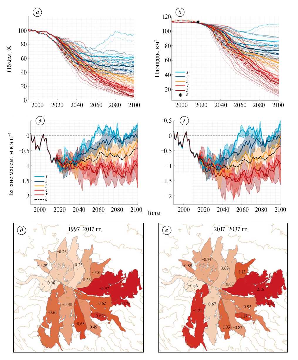 Изменения поверхностного баланса массы, площади и объёма ледников. Согласно расчётам, поверхностный баланс массы ледников Эльбруса (как, собственно, и всего северного склона Большого Кавказа, см. предыдущий раздел) в среднем продолжит уменьшаться до конца 2030-х годов, достигая значений –1.1±0.3 м в. э. год –1 в среднем по Эльбрусу (см. рис. 3, г). При этом различия в оценках, полученных в разных климатических сценариях, будут невелики.