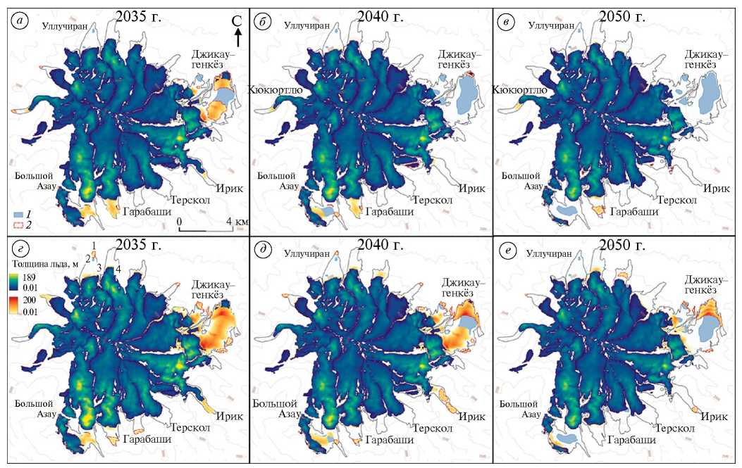 Fig. 5. Modelled configurations of Mount Elbrus glaciers under the median climate change scenario for different properties of the debris cover: (а, б, в) – for = 115 cm; (г, д, е) – for = 44 cm.: 1 – proglacial lakes; 2 – dead-ice areas, 3 – ice thickness (m) in debris-free mode; 4 – ice thickness (m) when modelling with transforming debris cover.