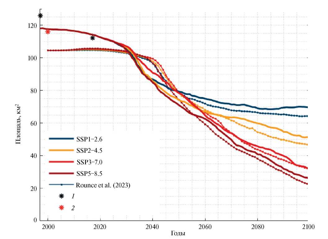 Рис. 7. Сравнение изменения площади оледенения Эльбруса в XXI веке по разным сценариям с результатами для тех же ледников Эльбруса, при использовании тех же калибровочных данных RGI6.0 из (Rounce et al., 2023; https://nsidc.org/data/hma2_ggp/versions/1). 1 – значения площади ледников, представленные в работе (Kutuzov et al., 2019) для 1997 и 2017 г., 2– площадь ледников согласно инвентаризации RGI6.0 в 2000 г.