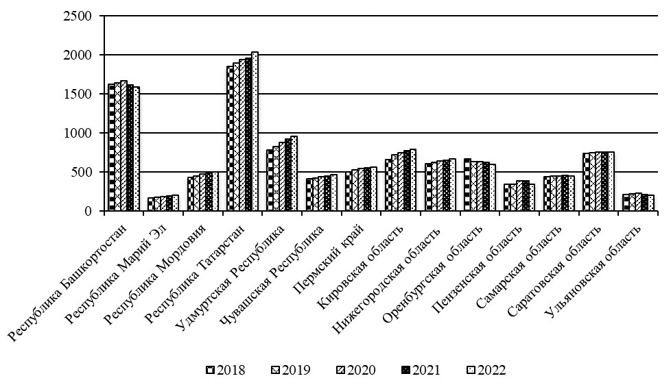 Figure 2. Dynamics of milk production in farms of all categories by regions of the Volga Federal District for 2018 — 2022, thousand tons