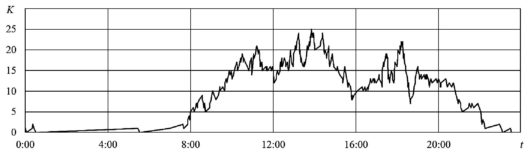 Рисунок 4. Зависимость от времени t (час:мин) заполняемости K (авт) парковочного пространства; рабочий день (среда), октябрь 2023 года