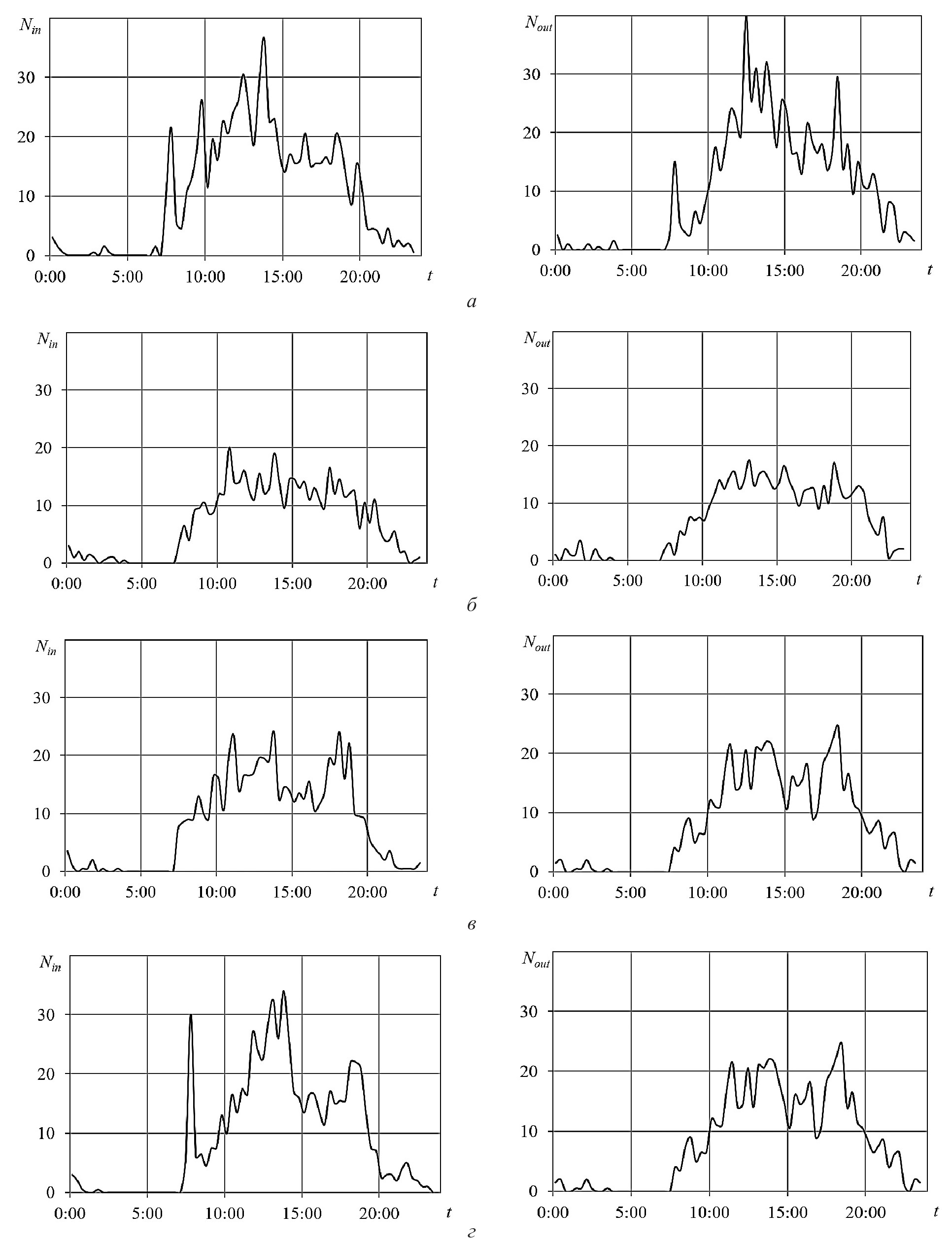 Осредненные по соответствующим месяцам интенсивности Nin и Nout въезда транспортных средств на парковочную территорию и выезда с нее, приведенные на рисунке 9, характеризуются значительной осцилляцией и в большинстве случаев однотипны, при этом, как правило интенсивности Nin и Nout имеют временной сдвиг относительно друг друга. В рабочие дни (с понедельника по субботу) интенсивность въезда не превышает 36,5 авт/час, интенсивность выезда – 40,0 авт/час; в нерабочие дни (воскресенье) интенсивность въезда не превышает 24,0 авт/час, интенсивность выезда – 39,0 авт/час;