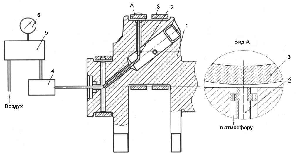 Измерения проводятся на остановленном двигателе в положении оси жиклеров вдоль оси шатуна в такте сжатия при закрытых клапанах. Для этого путем ручного поворота совмещаются специальные метки на маховике и неподвижном картере маховика и фиксировались показания индикатора. Индикатор по фактическому расходу воздуха, преобразованному в электрический сигнал через перепад давления на мембране преобразователя 2, показывал величину зазора в процентах [7].