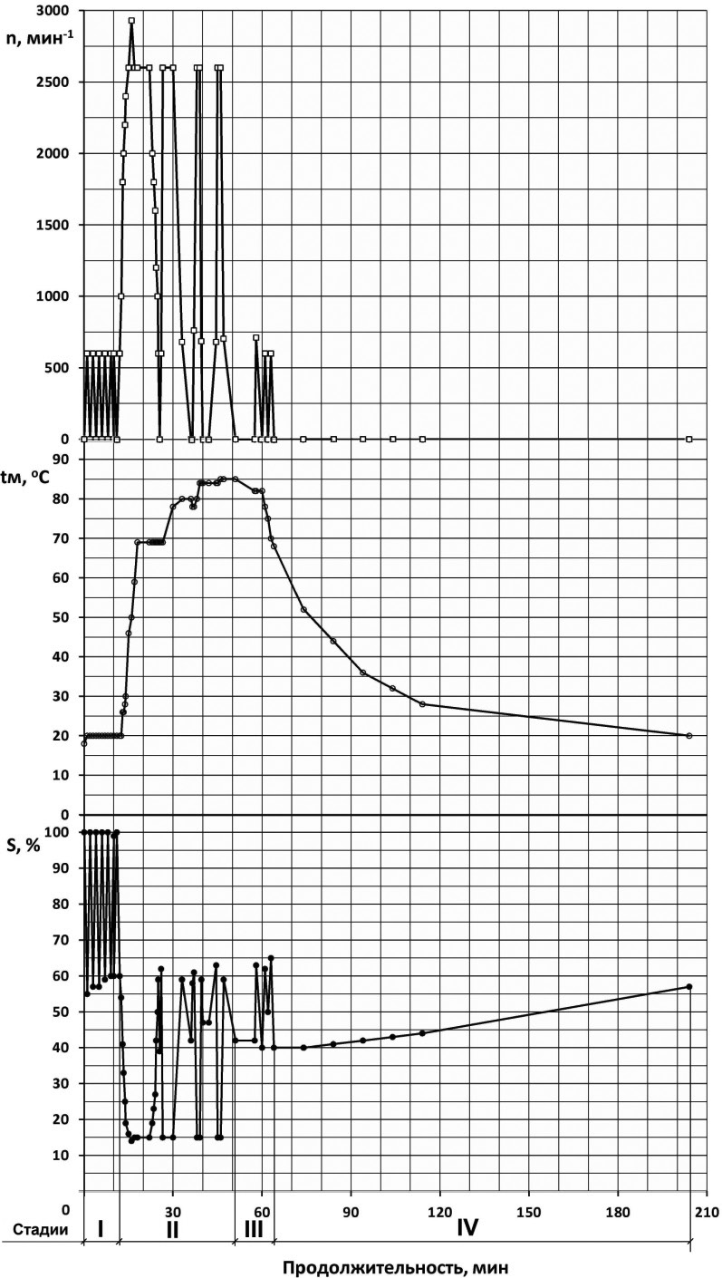 - на стадии «прожарки» значение параметра S уменьшилось до 15–17% при n = 2900 мин-1; после «прожарки» – увеличилось до 80 % при n = 300 мин-1;