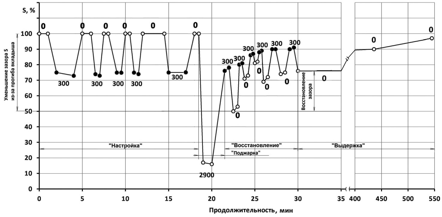 В целом, в ходе испытаний получены и зафиксированы фазы образования и нарастания прогиба до величины, равной 0,01∆S · Sо= 0,01 · 60 · 105 = 63 мкм, а также его релаксации за длительное время (от 3 ч до 9 ч), если режимы смазки сохраняются штатными (давление масла номинальное).