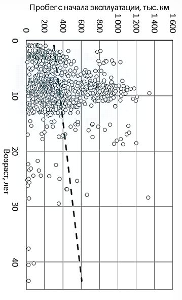 На первом этапе экспериментальных исследований проверено предположение об отсутствии корреляции между возрастом автомобилей и наработкой с начала эксплуатации. Результаты представлены на графике (рисунок 3). Проверка значения коэффициента корреляции по критерию Стьюдента показала отсутствие статистически значимой линейной корреляционной связи, что подтверждает выдвинутое предположение и свидетельствует о необходимости учета интенсивности эксплуатации при определении рационального срока службы автомобилей.