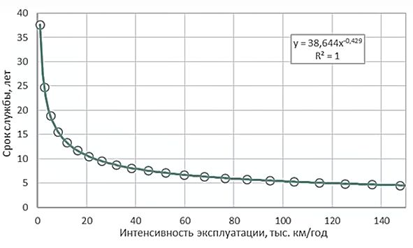 Рисунок 6. Влияние интенсивности эксплуатации на предельный срок службы автомобилей