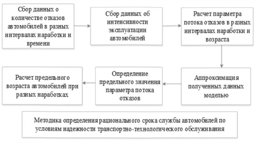 Методика определения рационального срока службы автомобилей по условиям надежности транспортно-технологического обслуживания предусматривает выполнение нескольких этапов расчетов (рисунок 7).