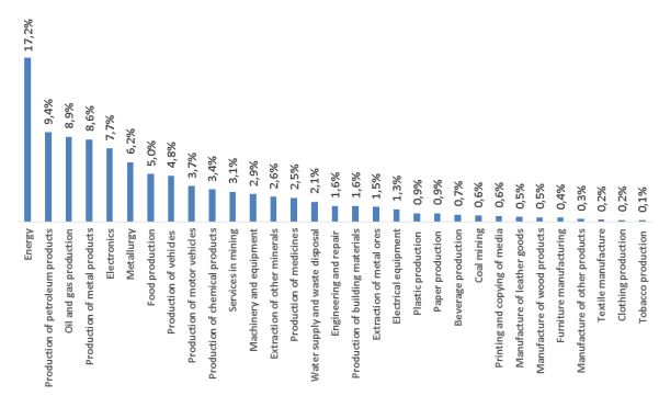 The budget for digital transformation is unevenly distributed among the regions. Thus, 75% of the digitalization budget falls on 10 industries (more than 30 in total) (Fig. 2). The industry leaders in terms of the absolute value of digitalization costs are energy, production of petroleum products, gas and oil production, metallurgy, electronics and tool industry.