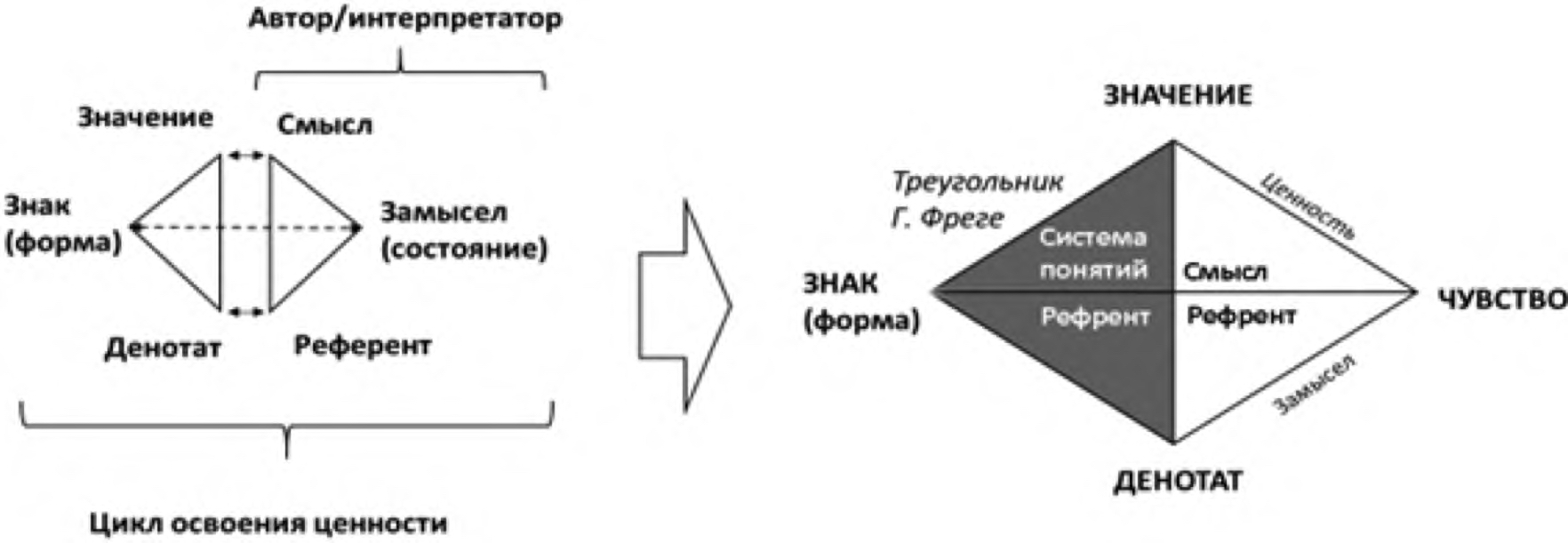 В конструкте «модального знака» синтактика, семантика и прагматика по-разному взаимодополняют каждый из подходов к определению ценности, образуя пространство текста культуры. И при этом, например, прагматическая составляющая больше ориентирована на оценку как деятельность, а семантическая — больше на состояние между субъектами. Там удерживается абстрагирующая, трансцендентная составляющая в семантическом толковании, а есть еще некая предпосылочность построения синтаксиса. Как я говорю, какими словами я пользуюсь, какими терминами, каков язык моей культуры и т.д.