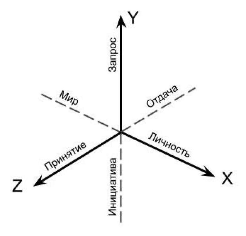 Система координат для ресурсной модели конфликта: ось x: «Личность – Мир»; ось y: «Запрос – Инициатива»; ось z: «Принятие – Отдача» (Составлено автором)