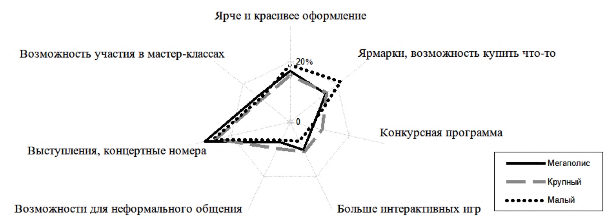 При этом доминирующая триада «выступление – оформление – ярмарки» более выражена для городских и коммерческих мероприятий. Значимость выступлений и оформления менее выражена у тех интересантов, кто чаще посещает клубно-студийные мероприятия (хотя у них более выражены ожидания деятельностного опыта, конкурсной программы и социальной активности).