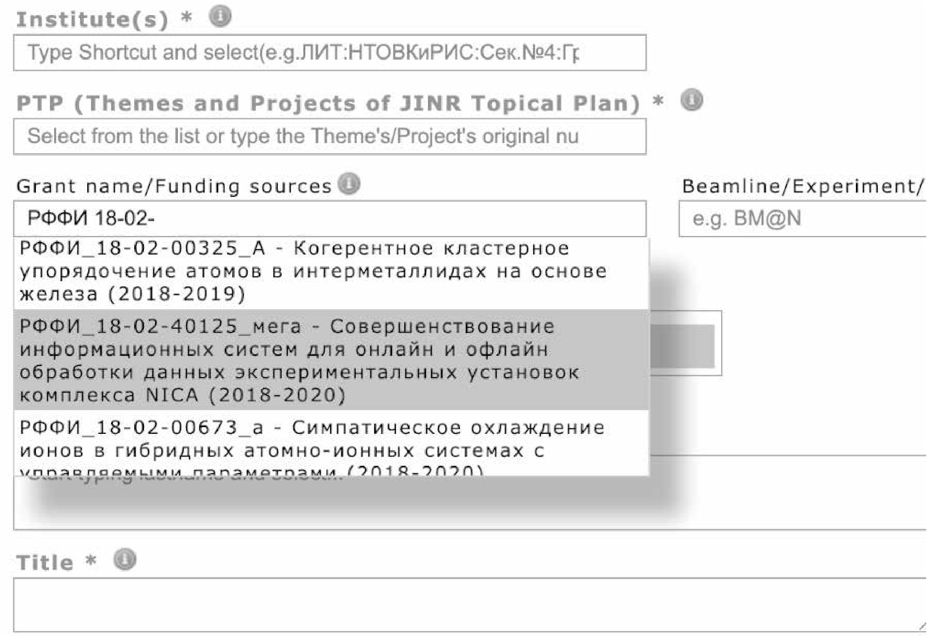 To reflect the information about grant support of the research work, resulting or describing in a publication, it is necessary to add the appropriate metadata to bibliographic description of this publication. Grant metadata is stored in the Authority Collection Grants (fig. 1) – catalog of research funding sources (JINR Themes/Projects, RFBR and RSF grants).