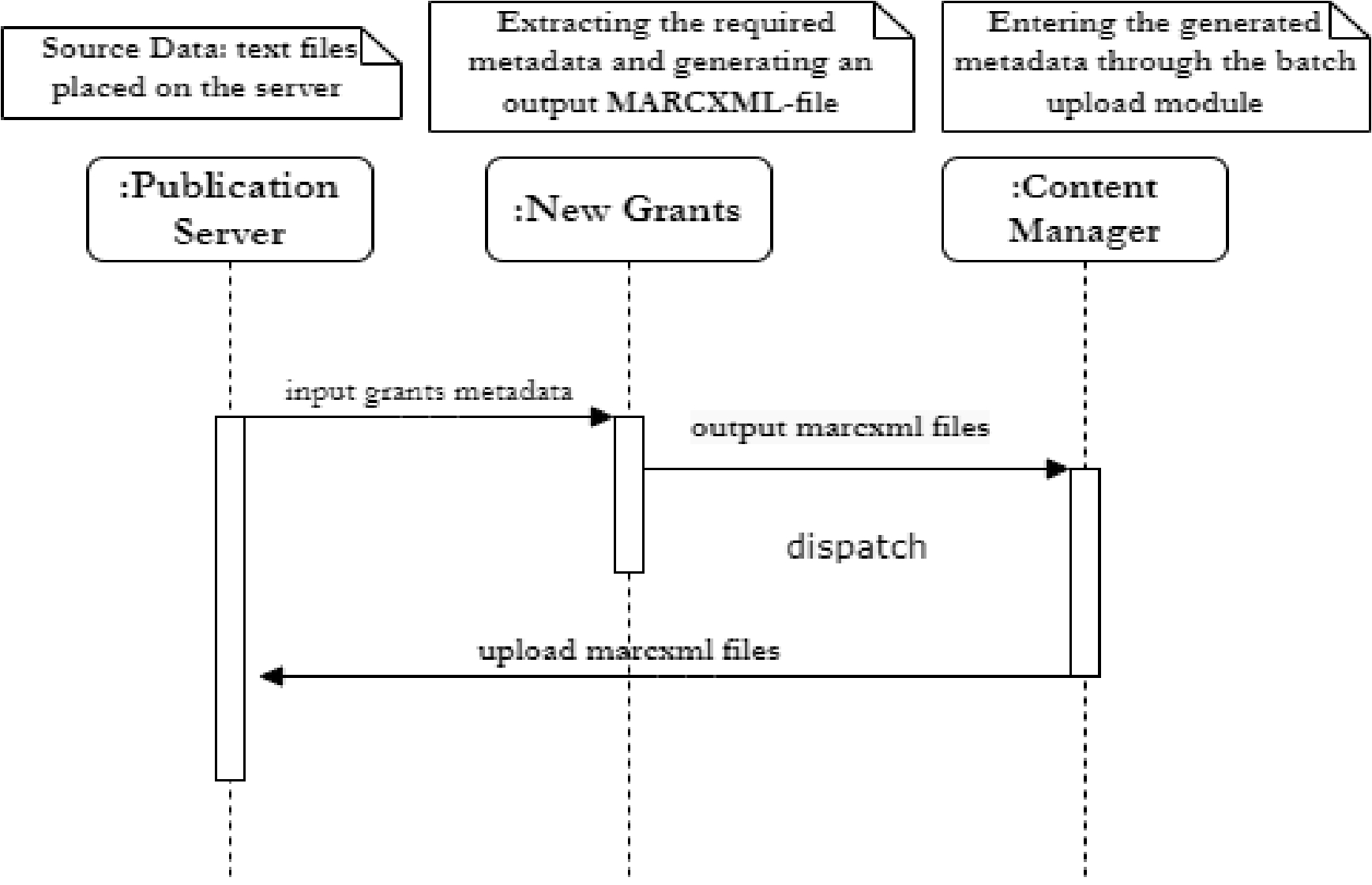 Fig. 3. Interaction of the server, module New Grants and content manager of institutional repository in the scenario of generating and loading metadata about new grants