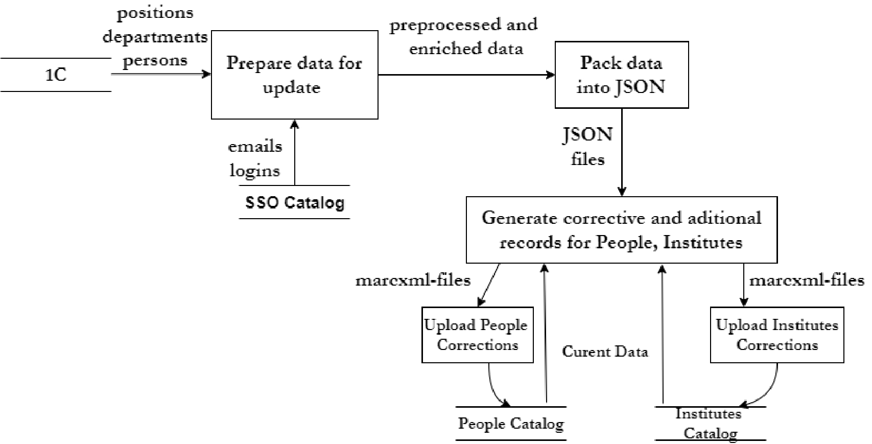 This service is currently running weekly. On average, the volume of corrective entries is: 25-35 updates (including dismissed and hired people) per week, 3-4 updates for departments per month. When the institutional repository is set to production mode, the service will be launched daily.