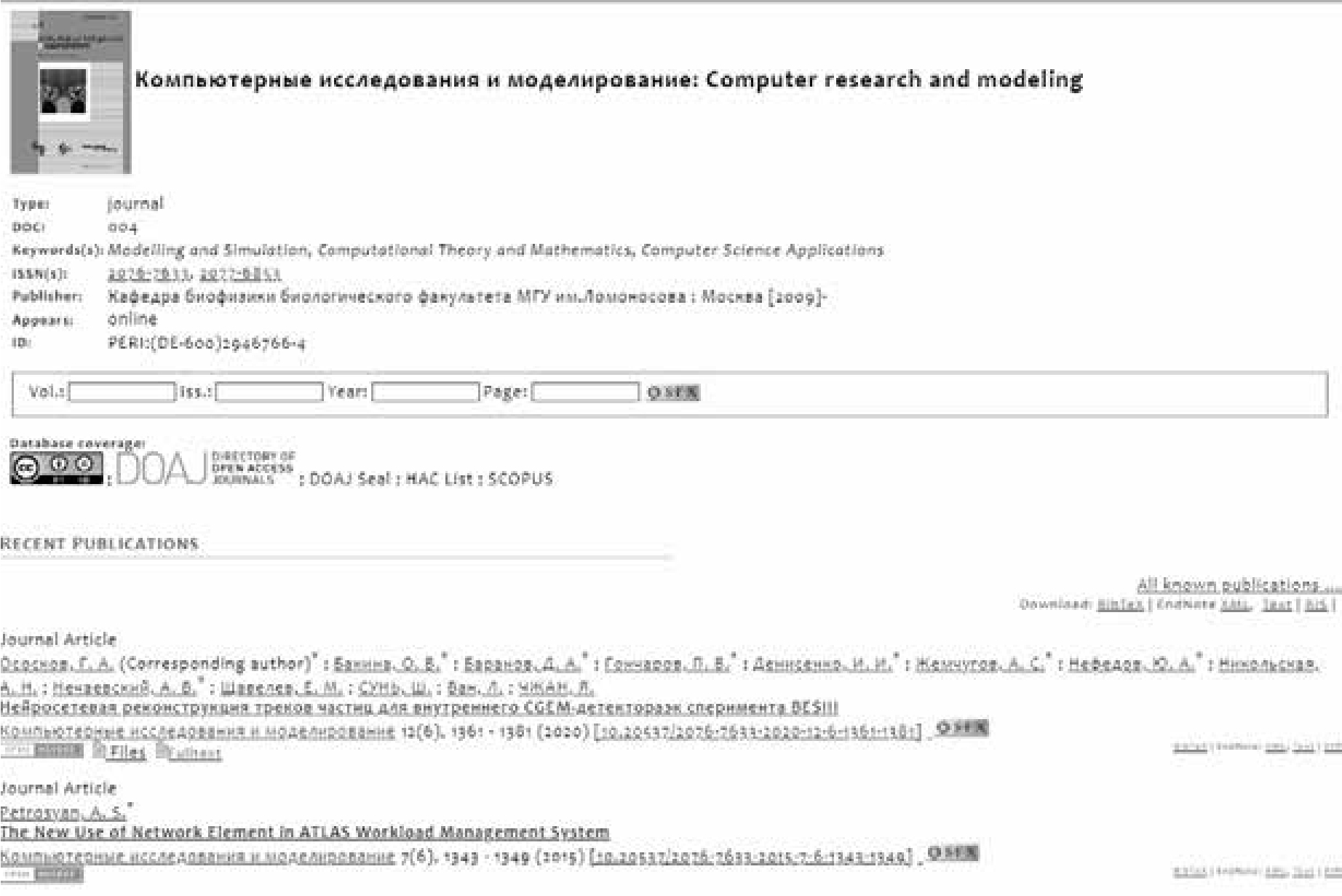 An example of this approach is presented in fig. 9. The authority record of the journal Computer research and modeling displays a list of publications published in it. The Database Coverage block displays the HAC List label.
