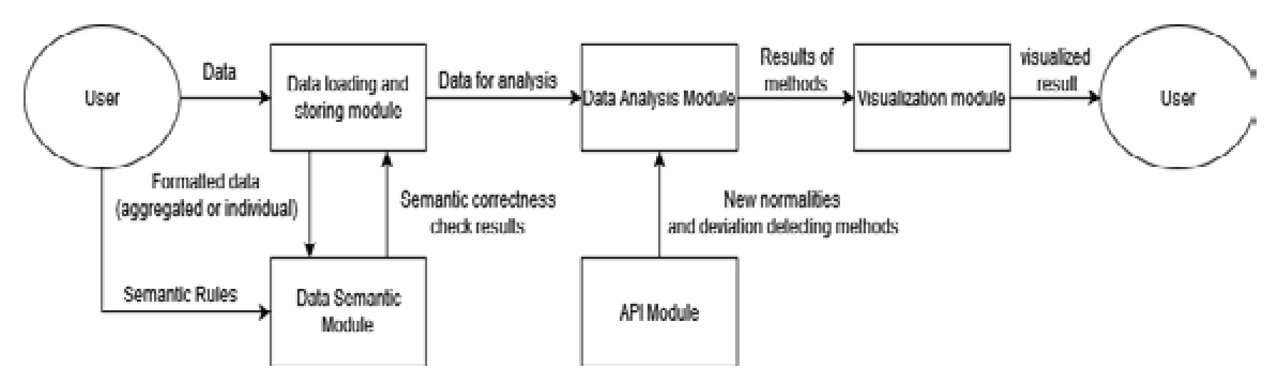 Our literature review shows that there are many methods for solving urban transport management problems. In addition, there are ready-made platforms that combine groups of such them. Typically, such platforms, for example [18], con tain a fixed set of algorithms that solve some previously known set of problems. Other platforms, such as [26], fix a specific problem-solving method. In [26], an architecture based on neural networks is fixed for solving regression problems. Such algorithms have low explainability and can be difficult to tune. We propose a new approach to the platform architecture for data analysis in digital urbanism. Amount of tasks that arise in urban infrastructure management reduces to the tasks of finding deviations from some given “normality”. Thus, to solve them, the platform must provide modules for working with the initial data, and modules for describing/obtaining normality and searching for deviations from it. There are two data processing modules. The first is for reading and loading data, storing it, and also checking the correctness of the data type. It is important to note that in urban studies, most of the analyzed data can be reduced either to correspondence matrices (cellular operator data, aggregated GPS, or smart card data) or to a form similar to that presented in Table 1 (individual GPS data, smart cards). This feature allows you to work with data from different sources in a unified way. The second module is responsible for the semantic validation of the submitted data according to heuristic rules. The third module of the platform provides some standard ways of describing normalities and methods for detecting deviations. As an example, the normality model presented in [8] can be taken. The API module will allow developers to define their own “normalities” and deviation-detecting methods. This module will allow the platform to overcome the limitations of existing platforms in the form of a fixed range of tasks to be solved and a fixed architecture for their solution since new normality and deviation-detecting methods can be defined on any data of one of two standard types. The results of the algorithms must be visualized in a form convenient for perception. The platform must contain a data visualization module to do this. One of the important parts of such a platform is methods for implementing visualization on city maps, and graphs. Ready-made solutions, such as [2], can be used as the basis for such methods. The platform architecture diagram is shown in Fig. 1 According to this architecture, it is possible to create a comprehensive platform for data analysis in urban studies. The main advantages of such a platform are the ability to work with different data sources, and the ability to dynamically expand the base of platform analysis methods using the API, which will eventually expand the range of tasks to be solved with low labor costs.