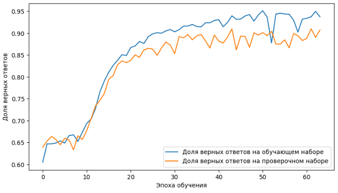 Рис. 4. Графики, показывающие долю верных ответов в процессе обучения модели на 64 эпохах