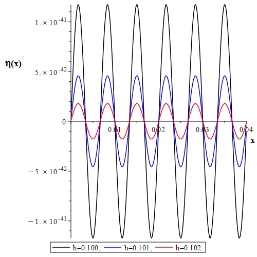 [Figure 2. Dependence of the profile of capillary waves formed in front of the barrier, depending on the depth of immersion of the wave dipole. Black line - for depth h=0.100; blue line - for depth h=0.101; red line - for depth h=0.102.]