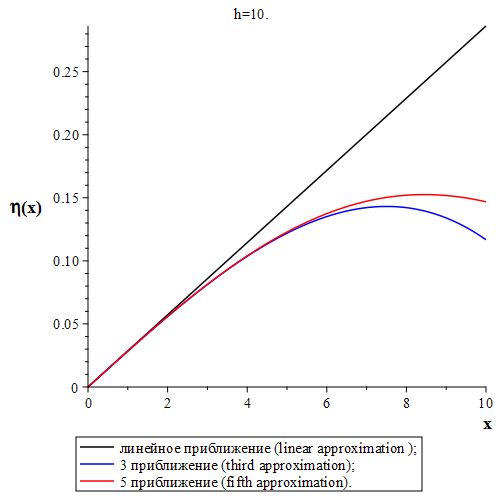 Фактически рис. 3 построен на основании последней формулы, а, следовательно, опираясь на разложение, можно сделать следующие ключевые выводы: во-первых, при малых расстояниях от источника возмущений профиль волны фактически линейный, приближения не вносят существенного влияния, то есть волна якобы стремиться к предельной форме; во-вторых, по мере удаления от волнового диполя начинает формироваться синусоидальный профиль волны-для третьего приближения (синяя линия) гребень является более пологим, чем для пятого приближения (красная линия). Черная линия (линейное приближение) представляет собой асимптоту для гребней синусоидальных гравитационных волн.