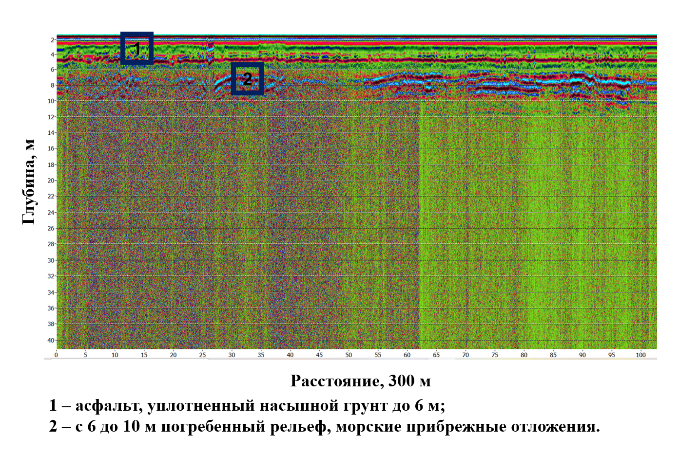 Рис. 5. Радарограмма 1, полученная в прибрежной зоне Култучного озера (город Петропавловск- Камчатский)