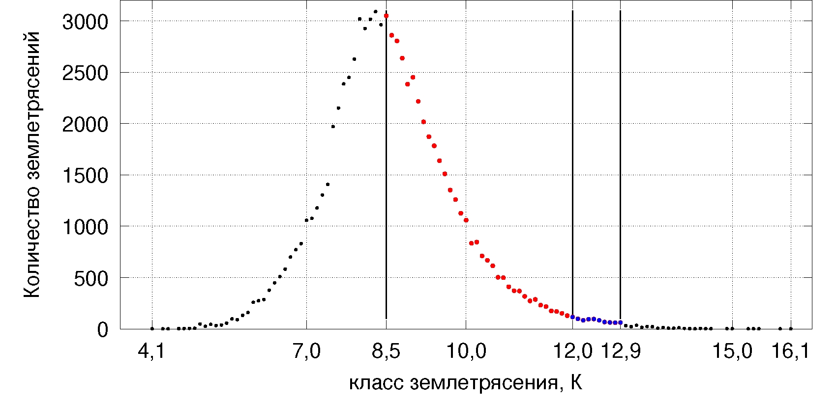 В исследовании используются землетрясения энергетических классов [8, 5; 12, 9] с количеством событий более 50 (таб. 1), которые выделены красным и синим цветами на графике. В исследовании не используются слабые землетрясения с энергией меньше класса 8,5, а также землетрясения энергетических классов, больших 12,9, в связи с непредставительностью выборки (количество событий менее 35). В рассматриваемой представительной выборке определяли афтершоки для более сильных землетрясений классов [12, 0; 12, 9], которые обозначены синим цветом на рисунке 1) (таб. 1). Отметим, что несмотря на большой объём каталога и объёмы выборок афтершоков для главных событий рассматриваемых классов (таб. 1), объёмы выборок афтершоков распределённых по энергиям не превышают 200 событий (таб. 2).