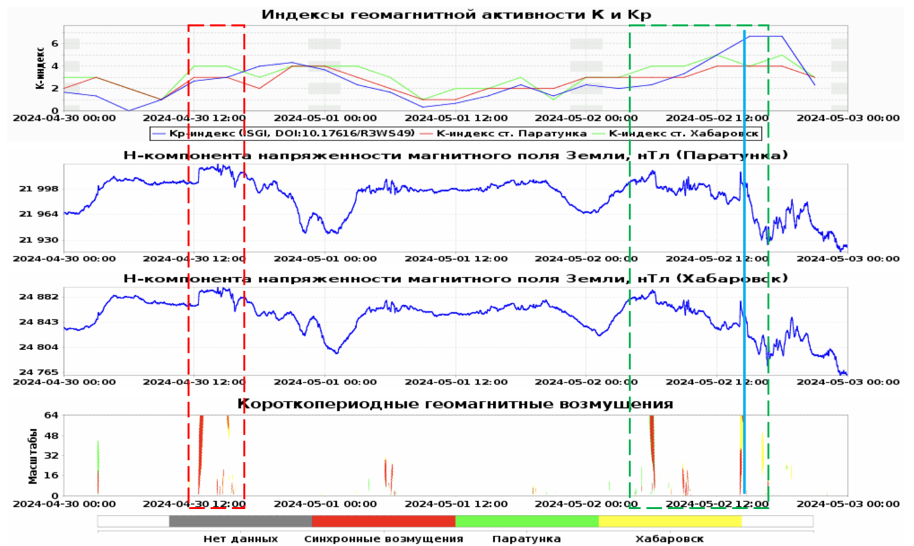 Далее, 02 мая в 13.// UTC пришел неоднородный ускоренный поток от выброса корональной массы (СМЕ от 01 мая), концентрация протонов которого составила 15 частиц/см3, флуктуации южной компоненты усилились до Bz= - 19 нТл, скорость солнечного ветра начала возрастать и к 02.// UTC 03 мая достигла значения 510 км/сек (http://ipg.geospace.ru/). По данным http://kakioka-jma.go.jp/ 02 мая 2024 г. в 14:07 UT началась геомагнитная буря (рис. 6, синяя вертикальная линия). После прихода СМЕ в системе на станциях «Паратунка» и «Хабаровск» выделены синхронные возмущения (рис. 6, зеленый прямоугольник). Особый интерес в задачах космической погоды имеют выделенные системой синхронные возмущения, произошедшие менее, чем за 12 часов до начала магнитной бури (рис. 6, зеленый прямоугольник). После начала магнитной бури система также показывает наличие возмущений в данных Н-компонент станций «Хабаровск» и «Паратунка» и возрастание локальных геомагнитных индексов (рис. 6).