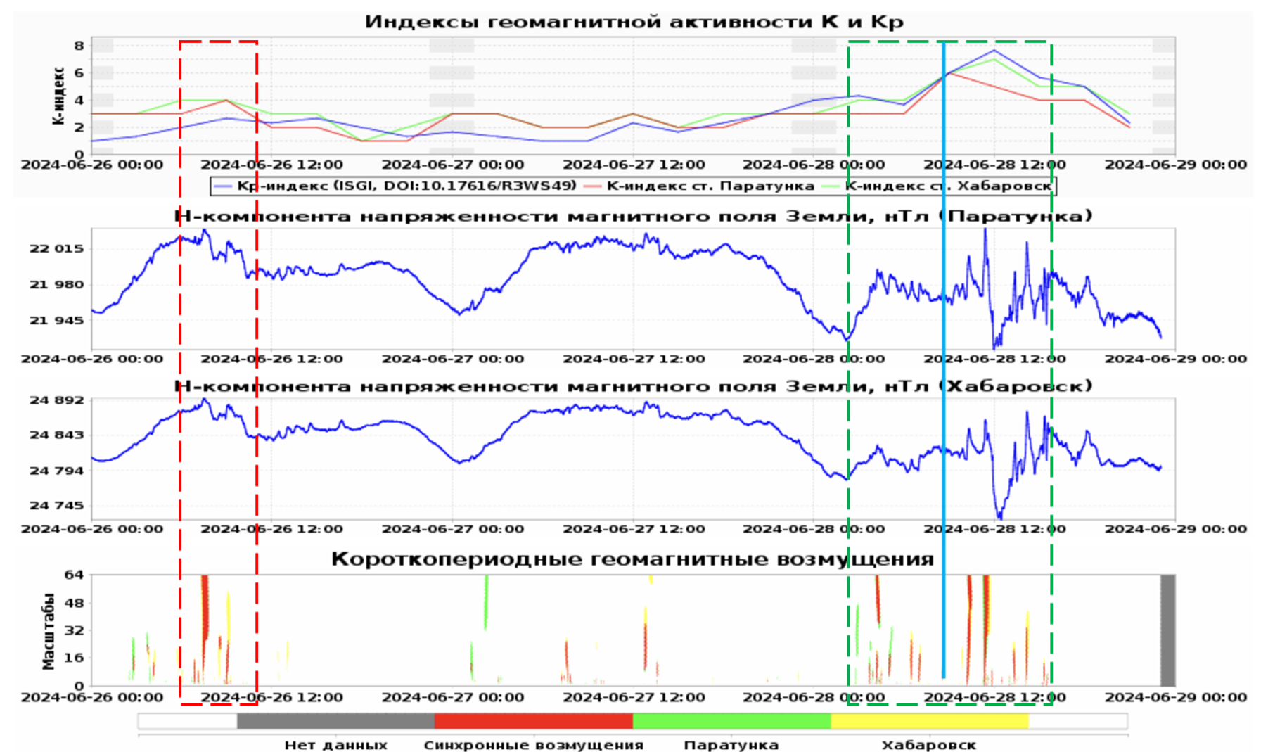 Основное событие началось 28 июня 2024 г. в 10:12 UT (http://kakioka-jma.go.jp/), что отмечено на рис. 7 синей вертикальной линией. По данным http://ipg.geospace.ru/ 28 июня в 08.// UTC пришел неоднородный ускоренный поток от корональной дыры (CIR), концентрация протонов которого составила 40 частиц/см3, флуктуации южной компоненты усилились до Bz = -24 нТл, скорость солнечного ветра начала увеличиваться и к 16.// UTC 28 июня достигла значения 500 км/сек. После прихода потока CIR системой зарегистрированы синхронные короткопериодные геомагнитные возмущения, локальные геомагнитные индексы превысили значение 7 (рис. 7, зеленый прямоугольник). Отметим, что накануне магнитной бури, за несколько часов до прихода потока CIR системой выделены короткопериодные возмущения на станции «Паратунка» и, с небольшой задержкой по времени, возмущения на станции «Хабаровск» (рис. 7, зеленый прямоугольник).