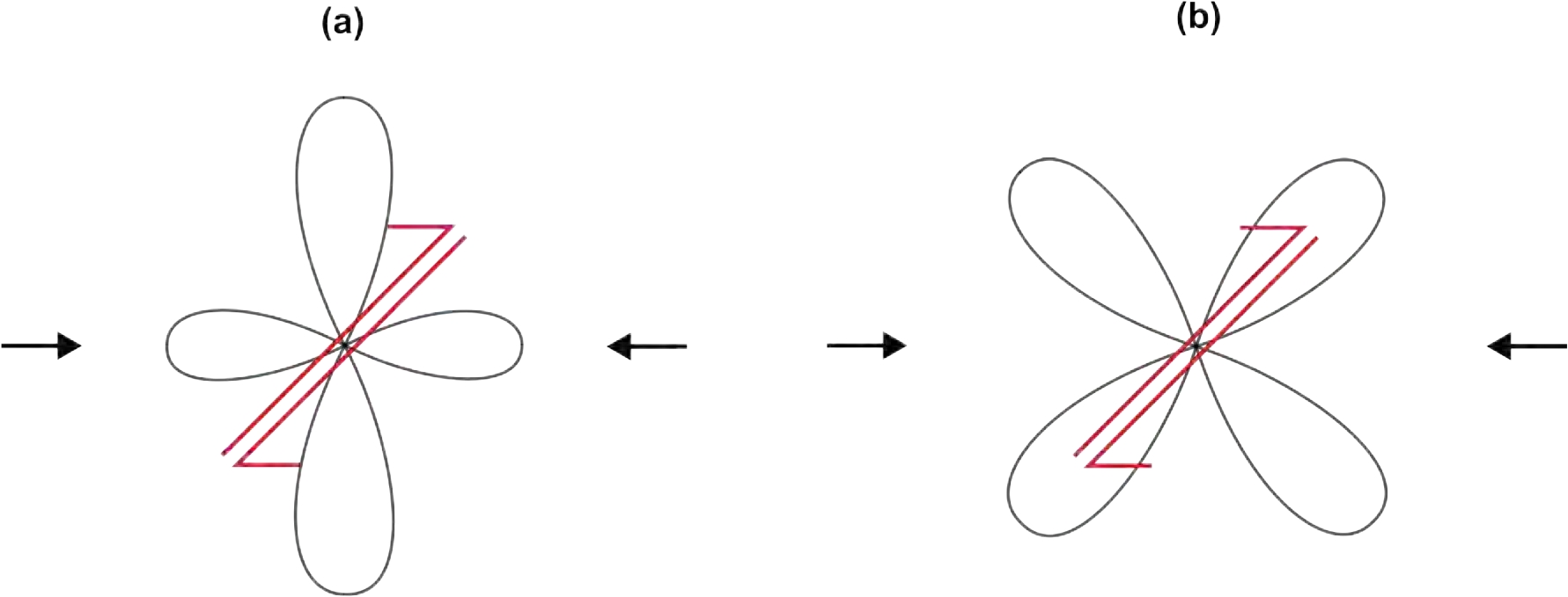Рис. 1. Диаграммы направленности продольных (a) и поперечных (b) акустических колебаний сдвиговых источников. Стрелками показана ось наибольшего сжатия.