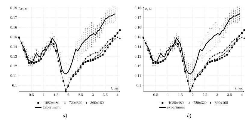 В работе [14] приводятся результаты измерения положения границ области с элегазом в различные моменты времени. На основе этих данных было вычислено значение ширины зоны с элегазом в эксперименте и выполнено сравнение с результатами расчетов в данной работе. На Рис. 5.2 приводится сравнение изменения ширины зоны с элегазом для различных методов на последовательности измельчающихся сеток. Видно, что до момента ( 1.5 MathType@MTEF@5@5@+= feaahGart1ev3aaatCvAUfeBSjuyZL2yd9gzLbvyNv2CaerbuLwBLn hiov2DGi1BTfMBaeXatLxBI9gBaerbd9wDYLwzYbItLDharqqtubsr 4rNCHbGeaGqiVu0Je9sqqrpepC0xbbL8F4rqqrFfpeea0xe9Lq=Jc9 vqaqpepm0xbba9pwe9Q8fs0=yqaqpepae9pg0FirpepeKkFr0xfr=x fr=xb9adbaqaaeGaciGaaiaabeqaamaabaabaaGcbaGaeyisISRaaG ymaiaai6cacaaI1aaaaa@39DA@  мс) прохождения вторичной ударной волны, отраженной от правой границы, все методы демонстрируют приемлемое совпадение изменения ширины наблюдаемой зоны с элегазом. Далее во всех расчетах значение ширины занижено, за исключением результатов, полученных с использованием реконструкции WENO5, которые попадают в доверительный интервал экспериментальных данных.