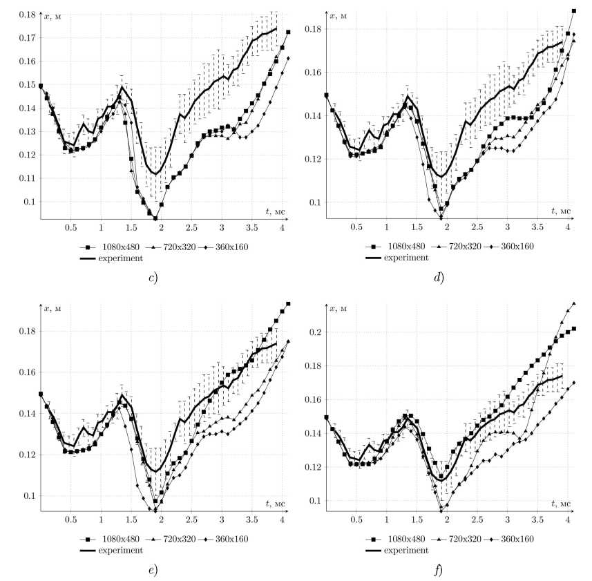 Рис. 5.2. Задача 1 – изменение ширины области с элегазом: a) схема первого порядка точности, поток LF; b) схема первого порядка точности, поток HLLC; c) реконструкция TVD2, поток LF; d) реконструкция TVD2, поток HLLC; e) реконструкция WENO5, поток LF; f) реконструкция WENO5, поток HLLC