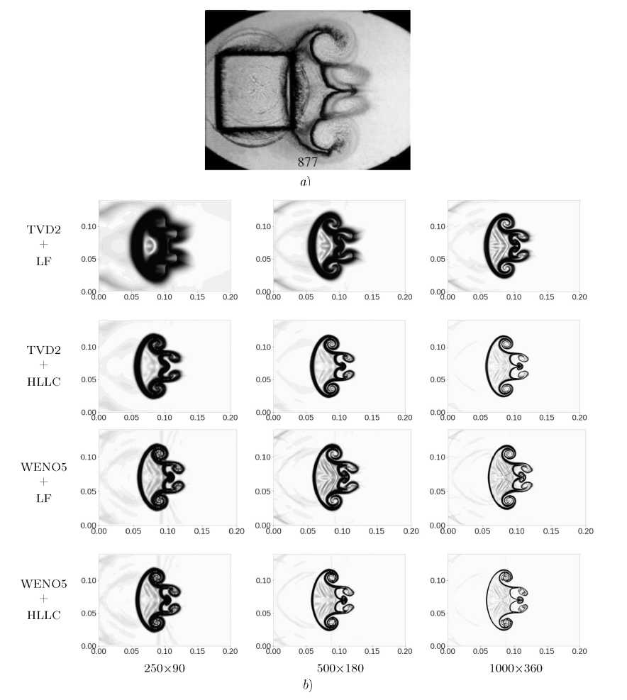 Fig 5.3. Problem 2 MathType@MTEF@5@5@+= feaahGart1ev3aqatCvAUfeBSjuyZL2yd9gzLbvyNv2CaerbuLwBLn hiov2DGi1BTfMBaeXatLxBI9gBaerbd9wDYLwzYbItLDharqqtubsr 4rNCHbGeaGqiVu0Je9sqqrpepC0xbbL8F4rqqrFfpeea0xe9Lq=Jc9 vqaqpepm0xbba9pwe9Q8fs0=yqaqpepae9pg0FirpepeKkFr0xfr=x fr=xb9adbaqaaeGaciGaaiaabeqaamaabaabaaGcbaqefmuySLMyYL gaiuaajugybabaaaaaaaaapeGaa83eGaaa@3A74@  numerical schlieren pictures at time 877 μ MathType@MTEF@5@5@+= feaahGart1ev3aaatCvAUfeBSjuyZL2yd9gzLbvyNv2CaerbuLwBLn hiov2DGi1BTfMBaeXatLxBI9gBaerbd9wDYLwzYbItLDharqqtubsr 4rNCHbGeaGqiVu0Je9sqqrpepC0xbbL8F4rqqrFfpeea0xe9Lq=Jc9 vqaqpepm0xbba9pwe9Q8fs0=yqaqpepae9pg0FirpepeKkFr0xfr=x fr=xb9adbaqaaeGaciGaaiaabeqaamaabaabaaGcbaGaeqiVd0gaaa@37AD@  s: a MathType@MTEF@5@5@+= feaahGart1ev3aaatCvAUfeBSjuyZL2yd9gzLbvyNv2CaerbuLwBLn hiov2DGi1BTfMBaeXatLxBI9gBaerbd9wDYLwzYbItLDharqqtubsr 4rNCHbGeaGqiVu0Je9sqqrpepC0xbbL8F4rqqrFfpeea0xe9Lq=Jc9 vqaqpepm0xbba9pwe9Q8fs0=yqaqpepae9pg0FirpepeKkFr0xfr=x fr=xb9adbaqaaeGaciGaaiaabeqaamaabaabaaGcbaGaamyyaaaa@36DD@ ) experiment [16]; b MathType@MTEF@5@5@+= feaahGart1ev3aaatCvAUfeBSjuyZL2yd9gzLbvyNv2CaerbuLwBLn hiov2DGi1BTfMBaeXatLxBI9gBaerbd9wDYLwzYbItLDharqqtubsr 4rNCHbGeaGqiVu0Je9sqqrpepC0xbbL8F4rqqrFfpeea0xe9Lq=Jc9 vqaqpepm0xbba9pwe9Q8fs0=yqaqpepae9pg0FirpepeKkFr0xfr=x fr=xb9adbaqaaeGaciGaaiaabeqaamaabaabaaGcbaGaamOyaaaa@36DE@ ) calculation results