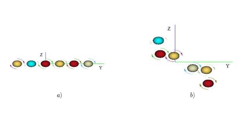 Рис. 5.4. Коллективная динамики кольца из пяти вращающихся частиц: a) начальная структура ( с); b) сохранение структуры в результате динамики вращающихся частиц ( с) Fig 5.4. Collective dynamics of a ring of five rotating particles: a) initial structure ( s); b) preservation of structure as a result of the dynamics of rotating particles ( s)