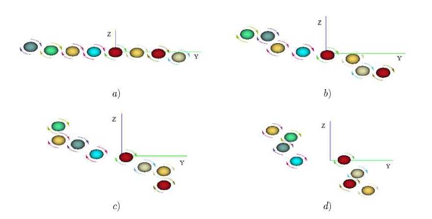 Рис. 5.2. Последовательное формирование структуры в результате коллективной динамики цепочки из 8 вращающихся частиц: a) фаза деформации цепочки ( с); b) разделение цепочки на две группы вращающихся частиц ( с); c), d) динамика образованной структуры из двух групп вращающихся частиц ( с) Fig 5.2. Sequential formation of a structure as a result of the collective dynamics of a chain of 8 rotating particles: a) chain deformation phase ( s); b) division of the chain into two groups of rotating particles ( s); c), d) dynamics of the formed structure of two groups of rotating particles ( s).