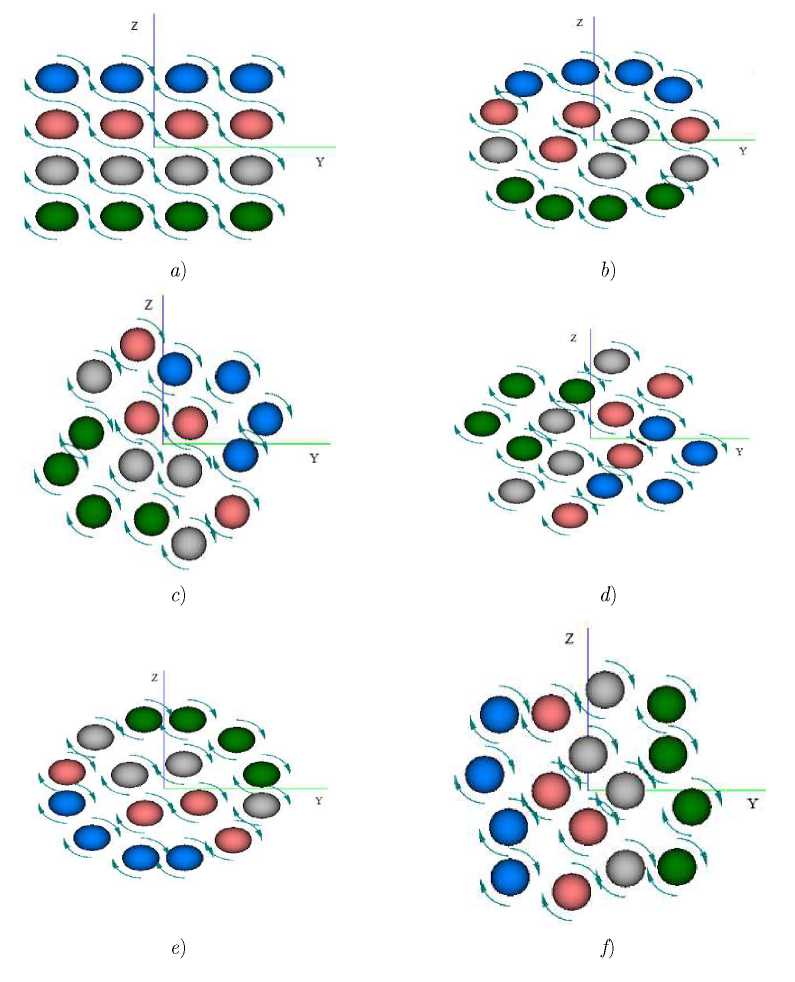Рис. 5.5. Характерные фазы динамической структуры из из 16 вращающихся частиц: a) начальная структура ( с); b), e) повторяющиеся фазы динамической структуры ( с); c) , d) , f) фазы перестройки динамической структуры ( с) Fig 5.5. Characteristic phases of the dynamic structure of 16 rotating particles: a) initial structure ( s); b), e) repeating phases of the dynamic structure ( s); c) , d) , f) phases of dynamic structure restructuring ( s)