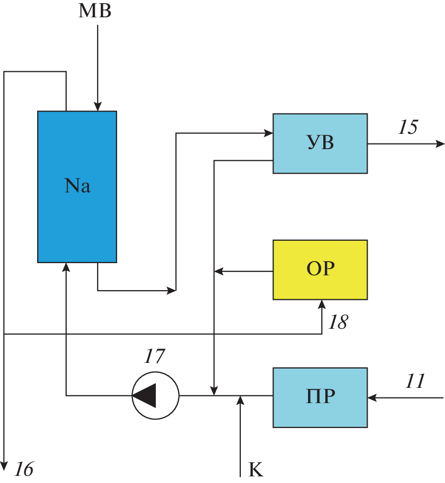 The article presents the results of a computational and analytical study of hybrid RO–MD (Reverse Osmosis–Membrane Distillation) technologies for desalination of the Caspian Sea, providing for the production of an additional amount of desalinated water by the MD method from RO concentrates heated to 50–80°C due to waste heat of fuel combustion products in steam boilers. Two options for solving the problem of the formation of CaCO3 and CaSO4 precipitates on membranes were studied: with preliminary nanofiltration (NF) or Na-cationation (Na) of sea water, as an alternative to the use of antiscalants (AS) and acid. The negative environmental effect of most plants (eutrophication of water bodies) and their low efficiency at high concentrations of desalinated water are taken into account. The Langelier index (СаСО3) and the degree of concentrate saturation (СаSO4) were used as criteria for precipitation of deposits on the membranes. The NF and RO processes were studied using the ROSA computer program, and the MD and Na processes were studied by computer simulation of the corresponding calculation models. It was found that at a 70% permeate yield at the NF and RO stages, the possibility of calcium precipitation on the RO and MD membranes is prevented, but their precipitation on the NF membranes is predicted, which makes the use of AS forced. At the same time, additional permeate production at the MD stage from RO concentrates reaches 40% of the amount of permeate from RO stadium, and the electricity consumption in general according to the scheme is 1.88 kWh/m3. Reducing the calcium hardness of sea water to 50 µg-eq/dm3 by the Na-cationization method makes it possible to refuse both the use of AS and acidification with sulfuric acid with additional production of MD permeate – 27% relative to RO permeate. Electricity consumption rises to 2.5 kWh/m3. To use the known advantages of NF without the use of AS, a hybrid Na–NF–RO–MD scheme is proposed. It has been established that at 80% yields of NF and RO permeates, to prevent the formation of CaSO4 precipitates at all stages of treatment, it is sufficient to reduce the hardness of sea water from 16 to 5.5 m-eq/dm3, and by acidifying the softened water to exclude the formation of CaCO3 precipitates.
