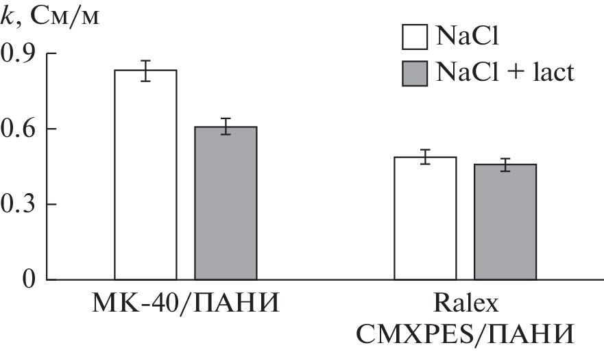 of lactose in a solution leads to a decrease in the conductivity of all studied membranes. However, the most significant effect is manifested for MK-40 membrane modified by polyaniline: its electrical conductivity is reduced by 15–25%. The diffusion permeability of the anion-exchange and initial cation-exchange membranes is poorly dependent on the presence of lactose in the solution. However, its decrease is observed by 2–2.5 times in the case of cation-exchange membranes modified by polyaniline. A significant effect of lactose on the current-voltage characteristics of the anion-exchange membranes has been found. This fact indicates significant adsorption of lactose on membrane surface in an external electric field. It is shown that ion-exchange membranes remain quite effective for electrodialysis of hydrochloric serum solutions, but their use is more effective at under limiting current modes.