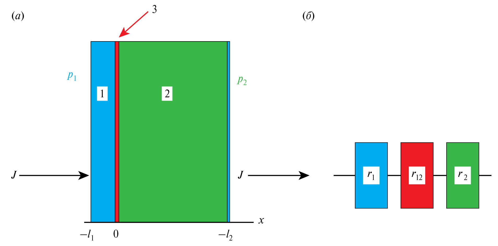 В дальнейшем будем исследовать газоперенос через плоскую бислойную мембрану, состоящую из селективного непористого полимерного слоя – i = 1, контактирующего с газом при давлении – p1 и промежуточного слоя из другого непористого полимера – i = 2, поверхность которого контактирует с газом при давлении – p2, причем p1 >> p2 (рис. 1a).