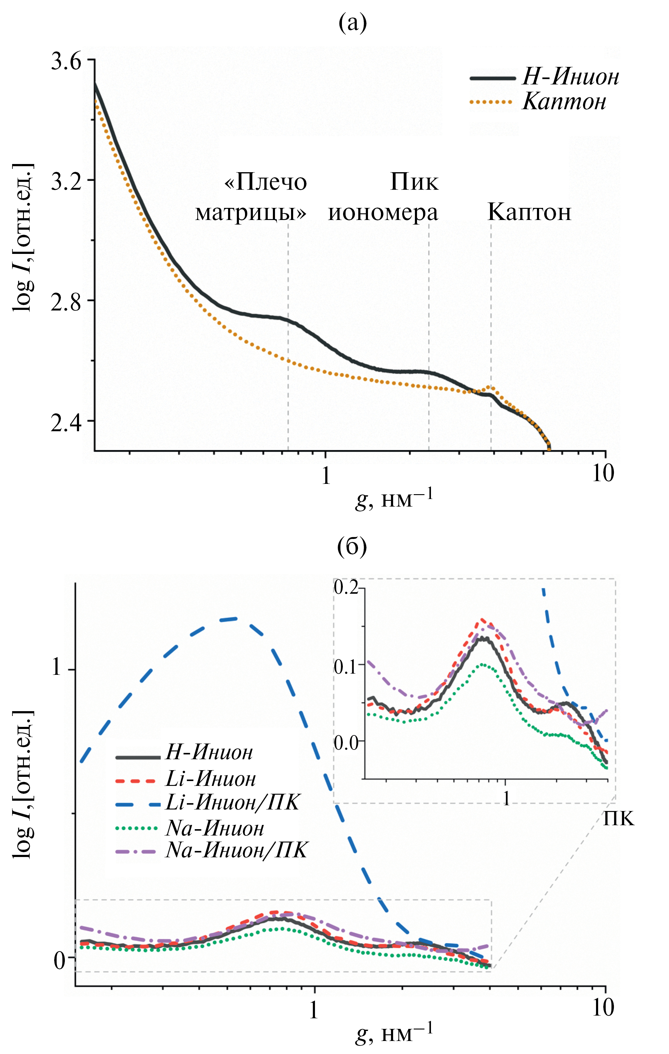 Надмолекулярная упаковка полимерной матрицы Инион исследовалась с помощью метода МУРР. Для этого образцы мембран запаковывались в сухой атмосфере в конверты из каптона (толщина каптона 6 мкм) для предотвращения контакта с водой из окружающей среды. Наибольший интерес представляет диапазон вектора рассеяния q = 0.3–3.3 нм–1, поскольку там не накладывается сигнал каптона (3.9 нм–1) и проявляются 2 характерных для таких систем пика (рис. 3а). По аналогии со спектрами мембраны Нафион было сделано предположение, что интенсивный пик с меньшими величинами qm ~ 0.6–0.8 нм–1 (называемый “плечо матрицы”, в англоязычных источниках “matrix knee”) соответствует межплоскостному расстоянию между кристаллическими доменами фторуглеродной цепи в аморфной полимерной матрице, а малоинтенсивный пик при qi ~ 2–3 нм–1 (пик иономера) – между гидрофильными доменами, сформированными ионообменными группами [57–63], который может отсутствовать для сухих мембран Нафион в разных катионных формах [20, 49, 64, 65].