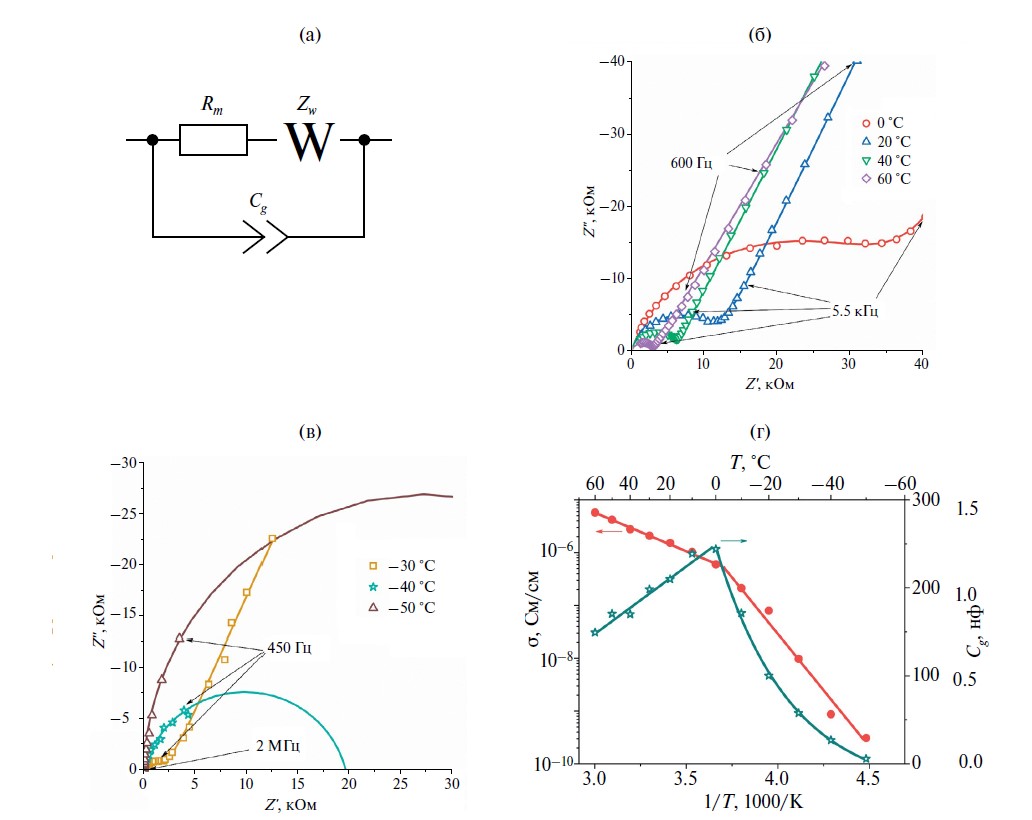 Рис. 4. (а) Эквивалентная схема спектров импеданса: Rm – сопротивление образца, Cg – геометрическая емкость измерительной ячейки, ZW – элемент Варбурга; (б) и (в) Годографы импеданса при разной температуре (точки – экспериментальные данные, линии – аппроксимация спектров импеданса по эквивалентной схеме); (г) температурные зависимости удельной ионной проводимости, геометрической емкости и диэлектрической проницаемости Na-Инион/ПК