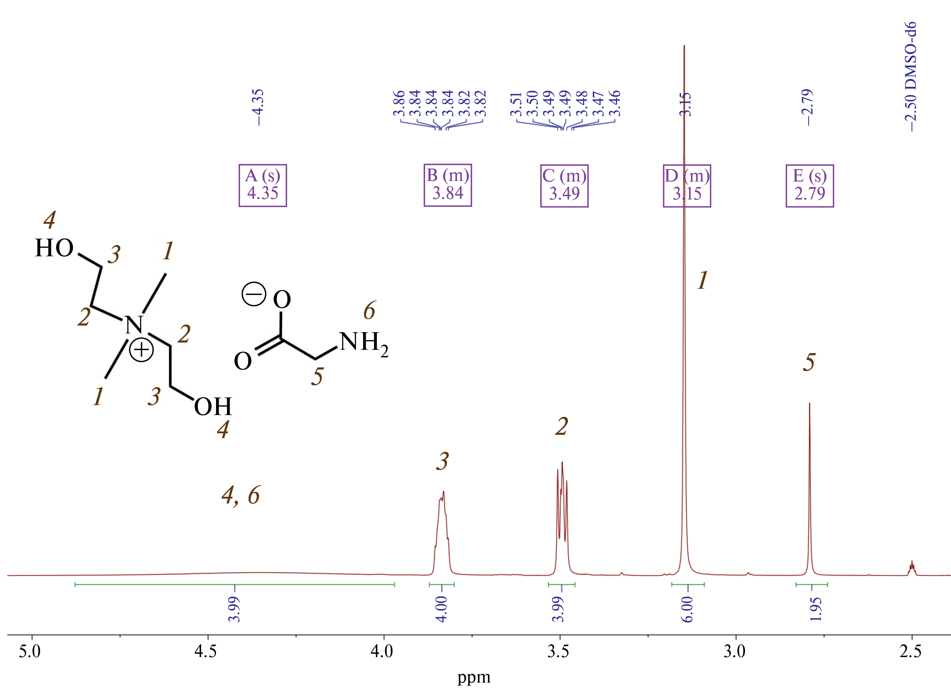 Спектр ЯМР 1Н [M2E2A][Gly] регистрировали на спектрометре Agilent DD2 (Agilent Technologies, США) 400 МГц (рисунок 1). Химические сдвиги (δ) указаны в миллионных долях (ppm) для раствора соединения в ДМСО-d6 с остаточным пиком растворителя в качестве внутреннего стандарта.