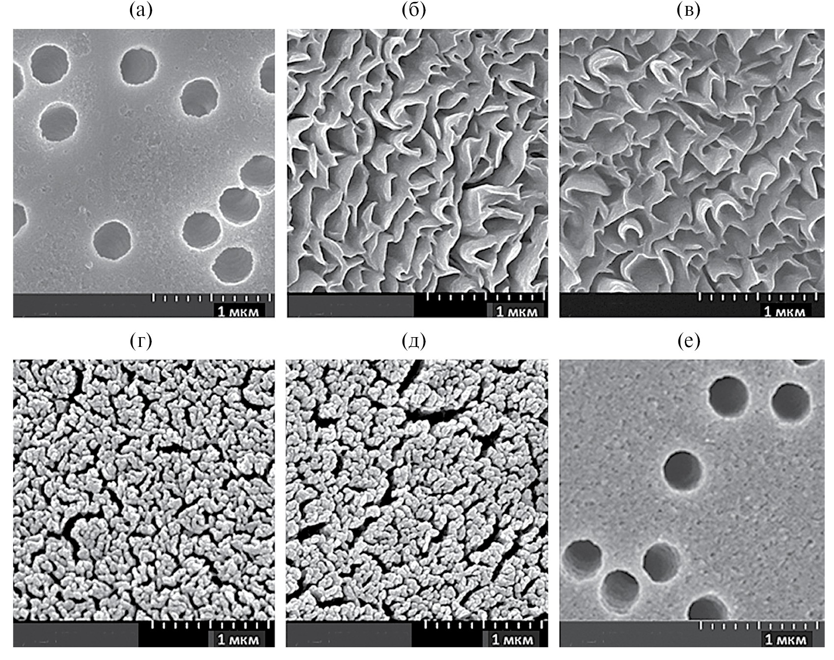 Формирование покрытий на поверхности исходной мембраны иллюстрирует рис. 1, на котором представлены изображения поверхностного слоя композиционных мембран, полученные методом растровой электронной микроскопии. Можно видеть: в процессе модифицирования на поверхности исходной мембраны (рис. 1а) образуются упорядоченные наноструктуры, размеры которых зависят от типа покрытия (рис. 1б–д). Наноструктуры, образующиеся при использовании в качестве мишени СВМПЭ значительно больше по размерам, чем наноструктуры сформированные при диспергировании ПТФЭ. Вместе с этим, как показали экспериментальные данные, диаметр пор на обратной стороне композиционных мембран остается неизменным (рис. 1е). Это свидетельствует о том, что осаждение покрытий методом электронно-лучевого диспергирования полимеров в вакууме происходит лишь на стороне трековой мембраны, подвергнутой модифицированию. Нанесение на поверхность ПЭТФ ТМ покрытий данным методом приводит, таким образом, к формированию композиционных мембран, имеющих асимметричную форму пор – диаметр пор на необработанной стороне мембран не изменяется, а на модифицированной стороне происходит его уменьшение. Аналогичные данные получены нами при исследовании модифицирования трековых мембран методом полимеризации в плазме [21] и магнетронного распыления полимеров в вакууме [26, 27].