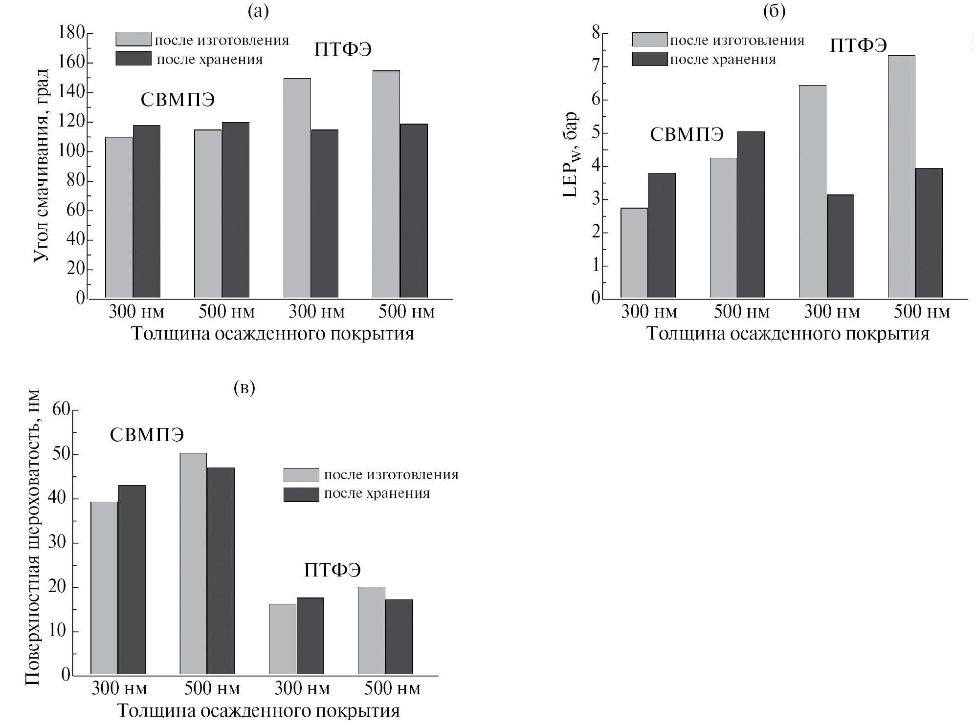 Изменение в смачиваемости композиционных мембран при хранении приводит к изменению значения минимально необходимого давления воды для проникновения ее в поры (рис. 4б), поскольку данная величина напрямую зависит от угла смачивания поверхностного слоя мембран. Если для мембран с покрытием из СВМПЭ наблюдается возрастание LEPW, то для мембран с покрытием из ПТФЭ происходит существенное уменьшение данной величины. Однако эти значения вполне сопоставимы со значением LEPW трековой мембраной из ПП с диаметром пор 250 нм, для которой эта величина составляет 2.95 бар. Это вполне позволяет использовать композиционные мембраны данного образца в процессах мембранной дистилляции для опреснения воды.