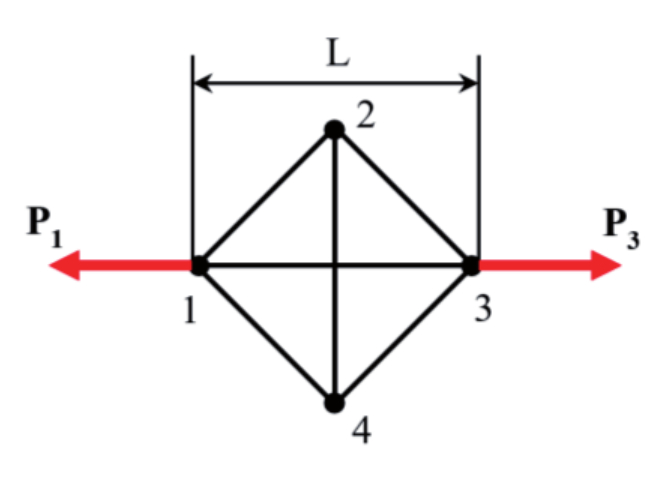 Стержни обозначены по номерам узлов. Приняты длины стержней и площади поперечных сечений . В данном примере стержни 13 и 24 называются прямыми в отличие от косых – 12, 23, 34, 41.