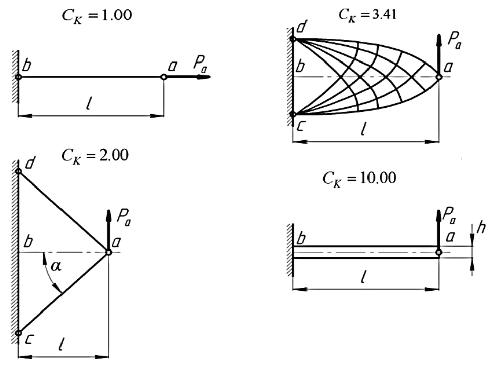 Рисунок 3 – Примеры простейших конструкций с соответствующими величинами безразмерного коэффициента силового совершенства [24]
