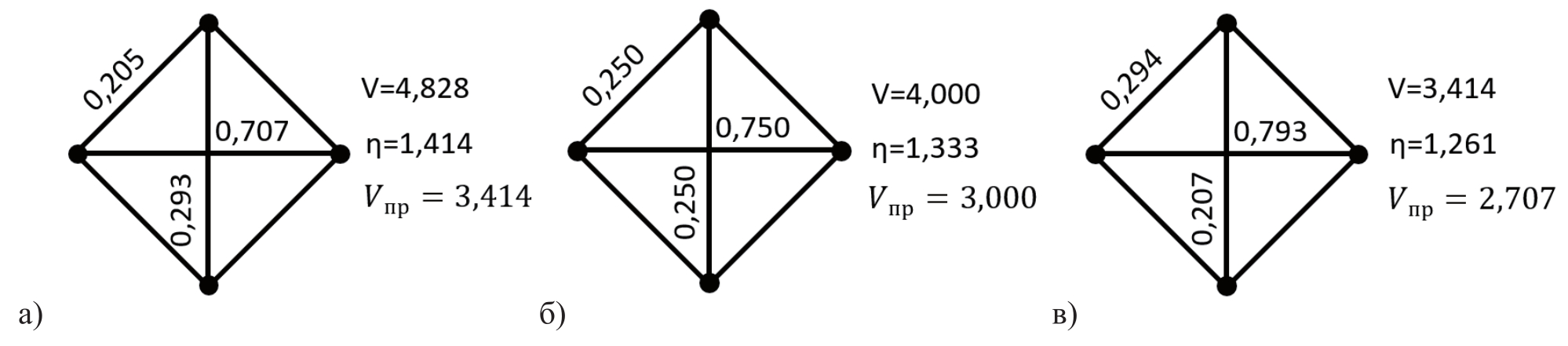 - Вычисление отношений потребных по прочности объёмов Vпр каждой из рассмотренных к минимальному объёму V4 = 4,0 конструкции из четырёх стержней, нагруженных только растяжением (рисунок 7а), даёт величины в среднем близкие к 6,0 (таблицы 2-4). Откуда следует, что хаотическое армирование в объёмных КМ позволяет реализовать не более 17% прочности армирующего материала. В примере раздела 2 соответствующее соотношение составило 3,0, которое хорошо известно для слоистых мембранных композитов и доказывается теоретически. Полученное в данной работе соотношение 6,0, по-видимому, соответствует теоретическому.