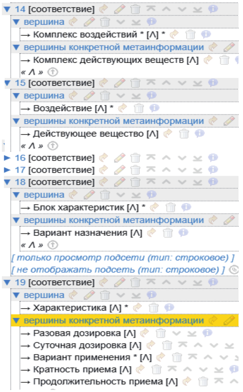 В таблице соответствий для медикаментозной терапии (рисунок 8) основная спецификация начинается с уровня Комплекс воздействий, где термин Воздействие заменён на Действующее вещество. Уточнение разделов, формирующих различные параметры, свойства и ограничения происходит следующим образом. Вершина Блок характеристик заменяется на Вариант назначения, а термину Характеристика сопоставляется сразу несколько разделов: Разовая дозировка, Суточная дозировка, Вариант применения, Кратность приёма, Продолжительность приёма.