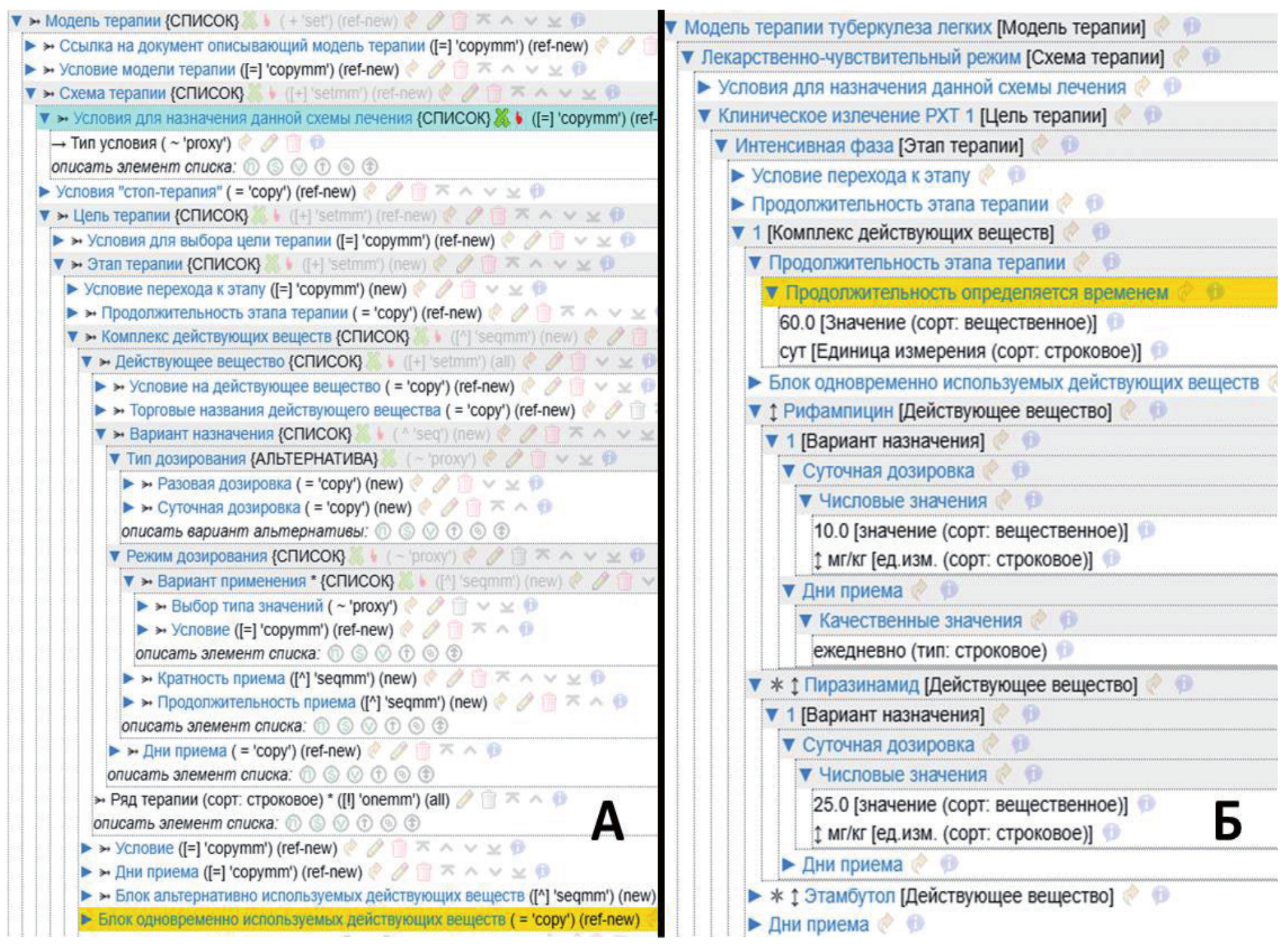 Рисунок 9 – Пример адаптации обобщённой онтологии к специализированной онтологии по назначению медикаментозного лечения и создания на её основе соответствующей БЗ: А – фрагмент онтологии назначения медикаментозного лечения, Б - БЗ о лечении туберкулеза