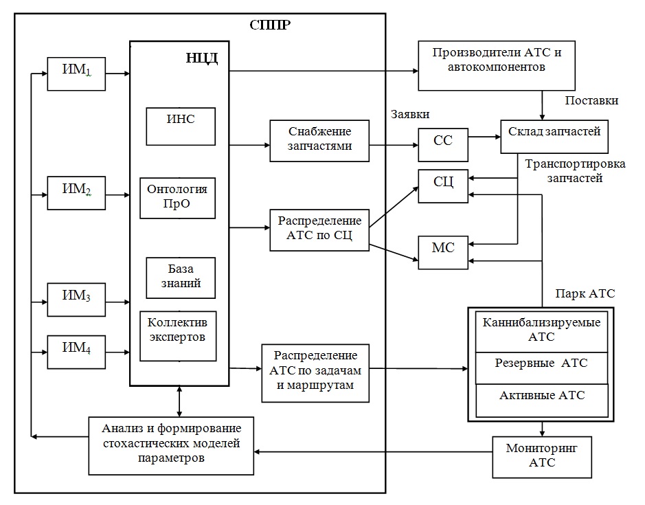 В статье рассматривается подход к построению системы ТОиР, функционирующей в едином информационном пространстве с цифровыми сервисами, парком АТС, комплексом технологического оборудования основного производства и производителем АТС. Новизна подхода заключается в использовании в СППР имитационных моделей (ИМ) дискретно-событийного типа на сетях Петри [10, 11].